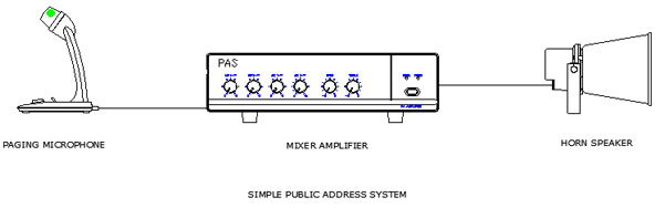 This typically comprises of a desk paging microphone, a mixer amplifier and a horn loudspeaker. When the press to talk switch is operated on the microphone, an announcement can be made to the loudspeaker via the amplifier.